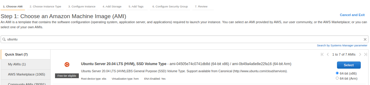 Select Ubuntu 20.04 LTS (HVM), SSD Volume Type for the operating system.