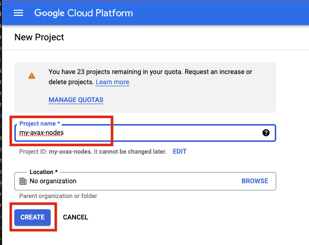 Login to the GCP Cloud Console and create a new Project in your organization. Let's use the name my-avax-nodes for the sake of this setup.