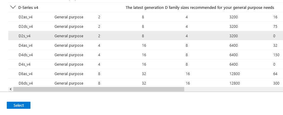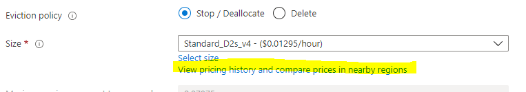 Choose "Select size" to change the Virtual Machine size, and from the menu select D2s_v4 under the D-Series v4 selection (This size has 2 Cores, 8 GB Memory and enables Premium SSDs). You can use F2s_v2 instances instead, with are 2 Cores, 4 GB Memory and enables Premium SSDs) but the spot price actually works out cheaper for the larger VM currently with spot instance prices. You can use this link to view the prices across the different regions.