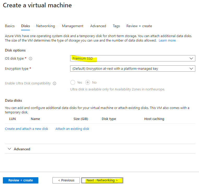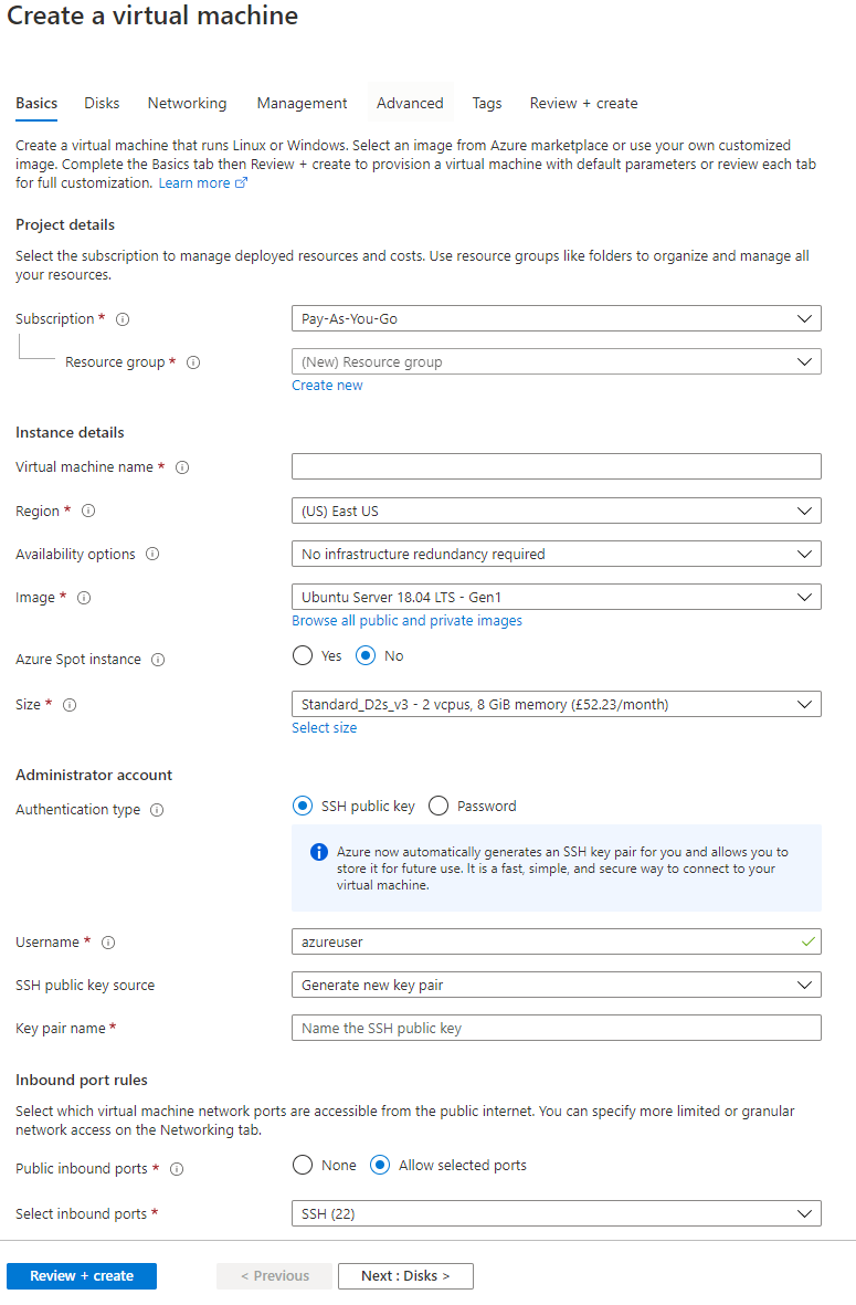 Select Next: Disks to then configure the disks for the instance. There are 2 choices for disks, either Premium SSD which offer greater performance with a 64 GB disk costs around 10amonth,orthereisthestandardSSDwhichofferslowerperformanceandisaround10 a month, or there is the standard SSD which offers lower performance and is around 5 a month. You also have to pay $0.002 per 10,000 transaction units (reads / writes and deletes) with the Standard SSD, whereas with Premium SSDs everything is included. Personally, I chose the Premium SSD for greater performance, but also because the disks are likely to be heavily used and so may even work out cheaper in the long run.