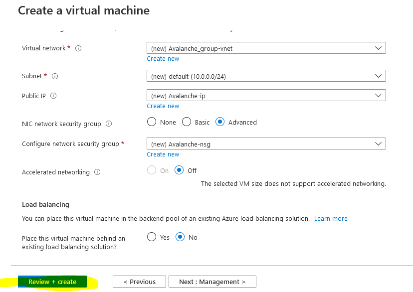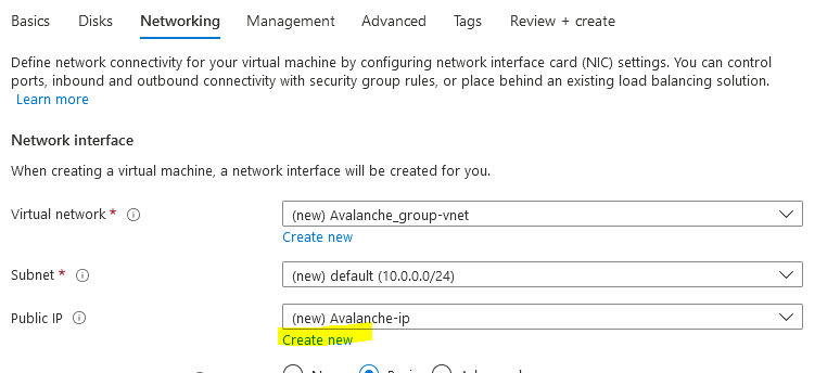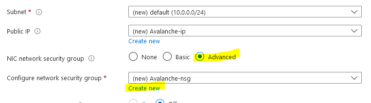 Then we need to configure the network security group to control access inbound to the Avalanche node. Select "Advanced" as the NIC network security group type and select "Create new"
