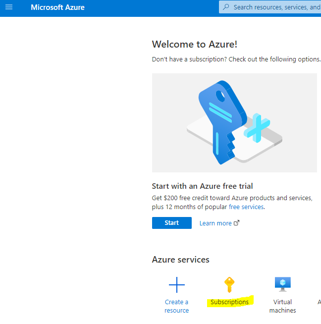 Once two factor has been configured log into the Azure portal by going to https://portal.azure.com and signing in with your Microsoft account. When you login you won't have a subscription, so we need to create one first. Select "Subscriptions" as highlighted below: