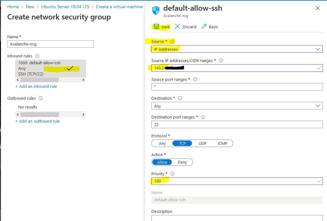 Now that you have your public IP select the default allow ssh rule on the left under inbound rules to modify it. Change Source from "Any" to "IP Addresses" and then enter in your Public IP address that you found from google in the Source IP address field. Change the Priority towards the bottom to 100 and then press Save.