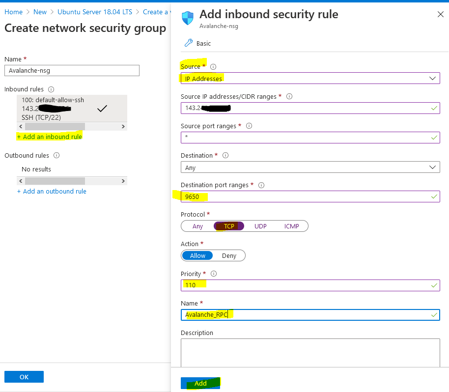 Then select "+ Add an inbound rule" to add another rule for RPC access, this should also be restricted to only your IP. Change Source to "IP Addresses" and enter in your public IP returned from google into the Source IP field. This time change the "Destination port ranges" field to 9650 and select "TCP" as the protocol. Change the priority to 110 and give it a name of "Avalanche_RPC" and press Add.