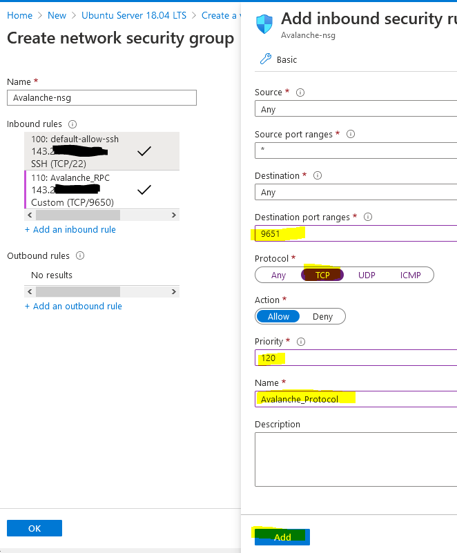 Select "+ Add an inbound rule" to add a final rule for the Avalanche Protocol so that other nodes can communicate with your node. This rule needs to be open to everyone so keep "Source" set to "Any." Change the Destination port range to "9651" and change the protocol to "TCP." Enter a priority of 120 and a name of Avalanche_Protocol and press Add.