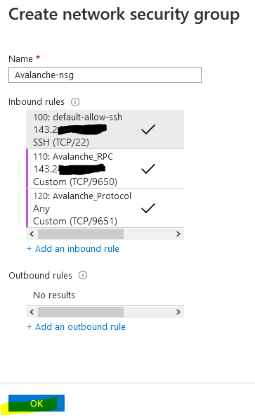 NOTE: If you need to change the network security group rules after deployment if your home IP has changed, search for "avalanche-nsg" and you can modify the rule for SSH and Port 9650 with the new IP. Port 9651 needs to remain open to everyone though as that's how it communicates with other Avalanche nodes.