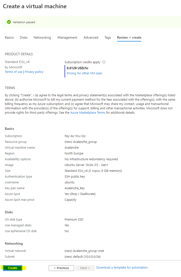 First it will perform a validation test. If you receive an error here, make sure you selected Pay-As-You-Go subscription model and you are not using the Free Trial subscription as Spot instances are not available. Verify everything looks correct and press "Create"