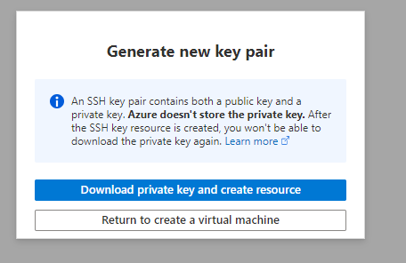 You should then receive a prompt asking you to generate a new key pair to connect your virtual machine. Select "Download private key and create resource" to download the private key to your PC.