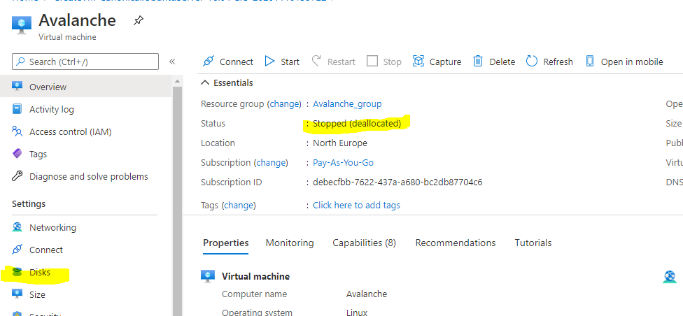 To change the Disk size, the VM needs to be stopped and deallocated. Select "Stop" and wait for the status to show deallocated. Then select "Disks" on the left.