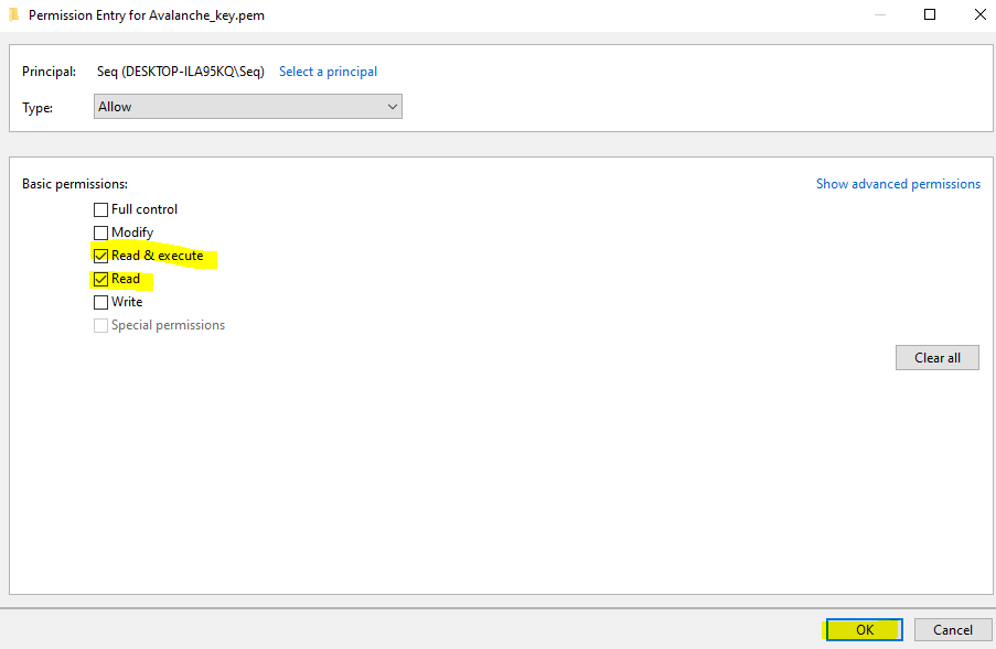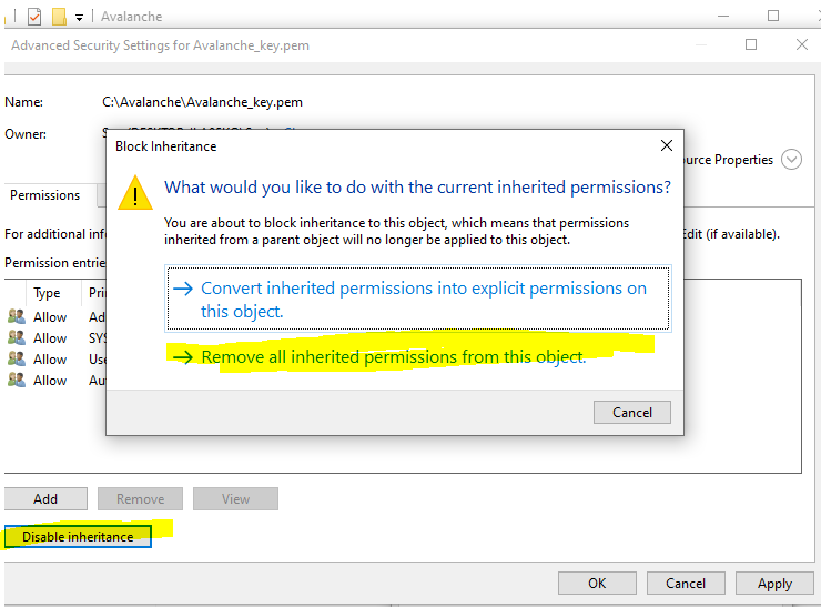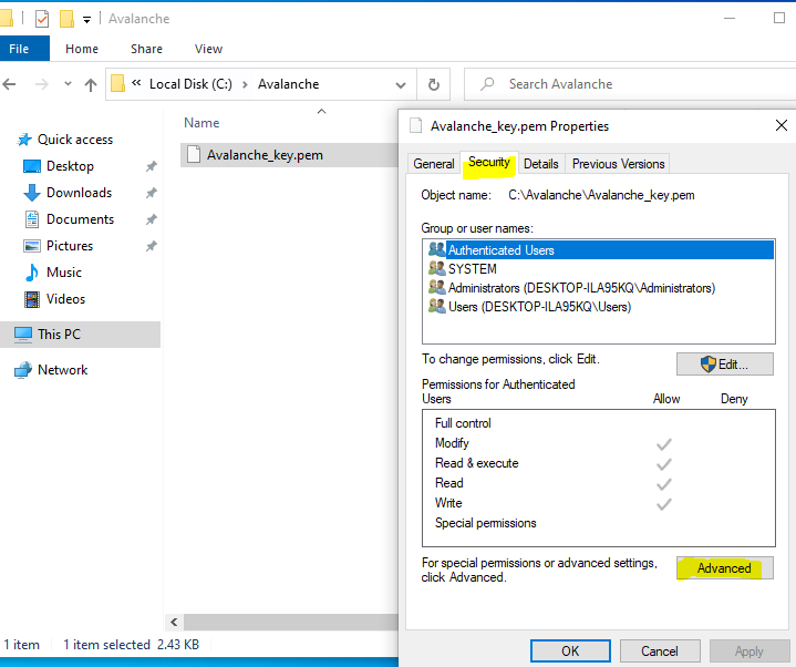 On your local PC, create a folder on the root of the C: drive called Avalanche and then move the Avalanche_key.pem file you downloaded before into the folder. Then right click the file and select Properties. Go to the security tab and select "Advanced" at the bottom