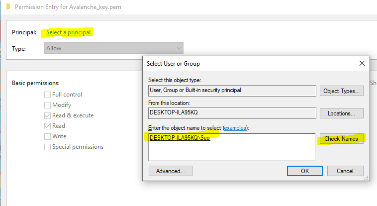 Then select "Add" to add a new permission and choose "Select a principal" at the top. From the pop-up box enter in your user account that you use to log into your machine. In this example I log on with a local user called Seq, you may have a Microsoft account that you use to log in, so use whatever account you login to your PC with and press "Check Names" and it should underline it to verify and press OK.