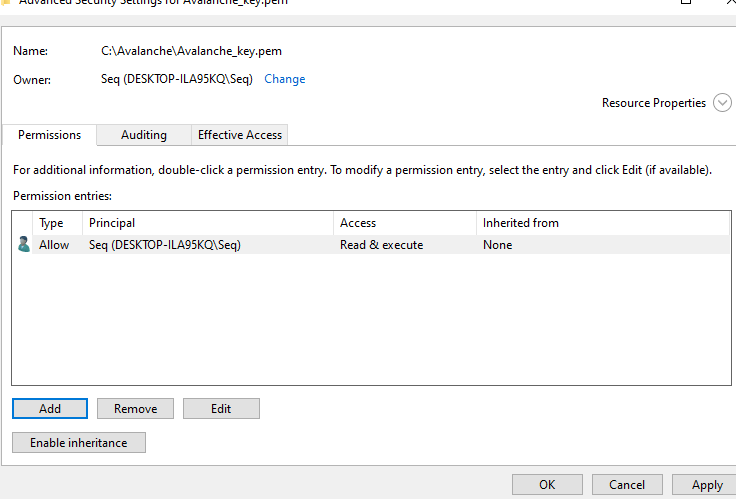 It should look something like the below, except with a different PC name / user account. This just means the key file can't be modified or accessed by any other accounts on this machine for security purposes so they can't access your Avalanche Node.