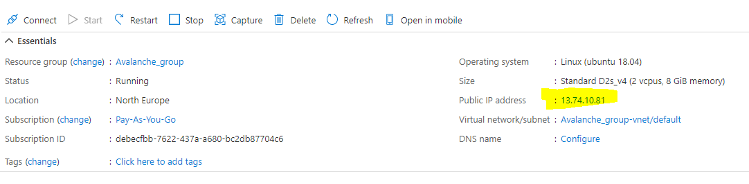 From the Azure Portal make a note of your static public IP address that has been assigned to your node.
