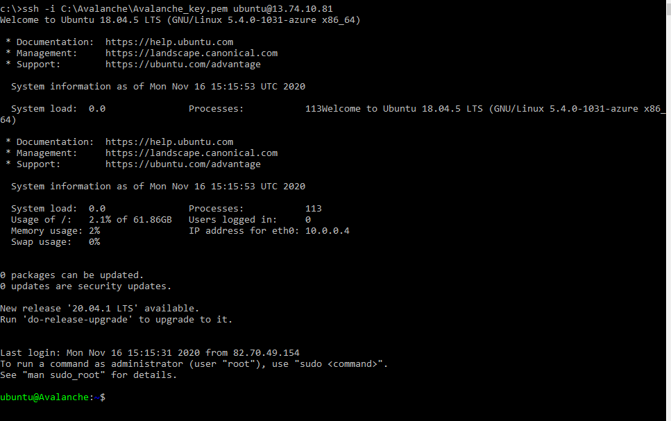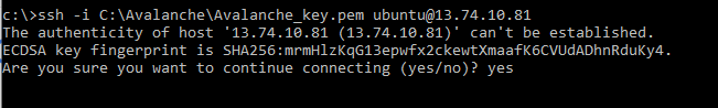 ssh -i C:\Avalanche\Avalanche_key.pem ubuntu@EnterYourAzureIPHere