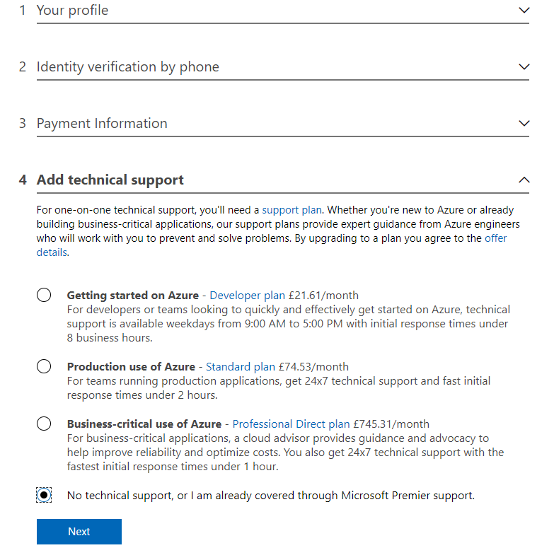 Enter your billing details and confirm identity as part of the sign-up process, when you get to Add technical support select the without support option (unless you want to pay extra for support) and press Next.