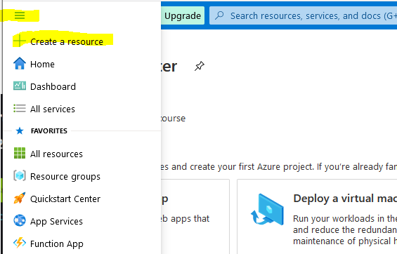 Now that we have a subscription, we can create the Ubuntu Virtual Machine for our Avalanche Node. Select the Icon in the top left for the Menu and choose "+ Create a resource"