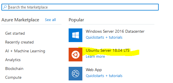 Select Ubuntu Server 18.04 LTS (this will normally be under the popular section or alternatively search for it in the marketplace)