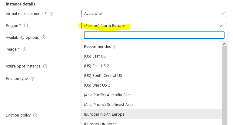 Then select a region from the drop-down list. Select one of the recommended ones in a region that you prefer as these tend to be the larger ones with most features enabled and cheaper prices. In this example I have selected North Europe.